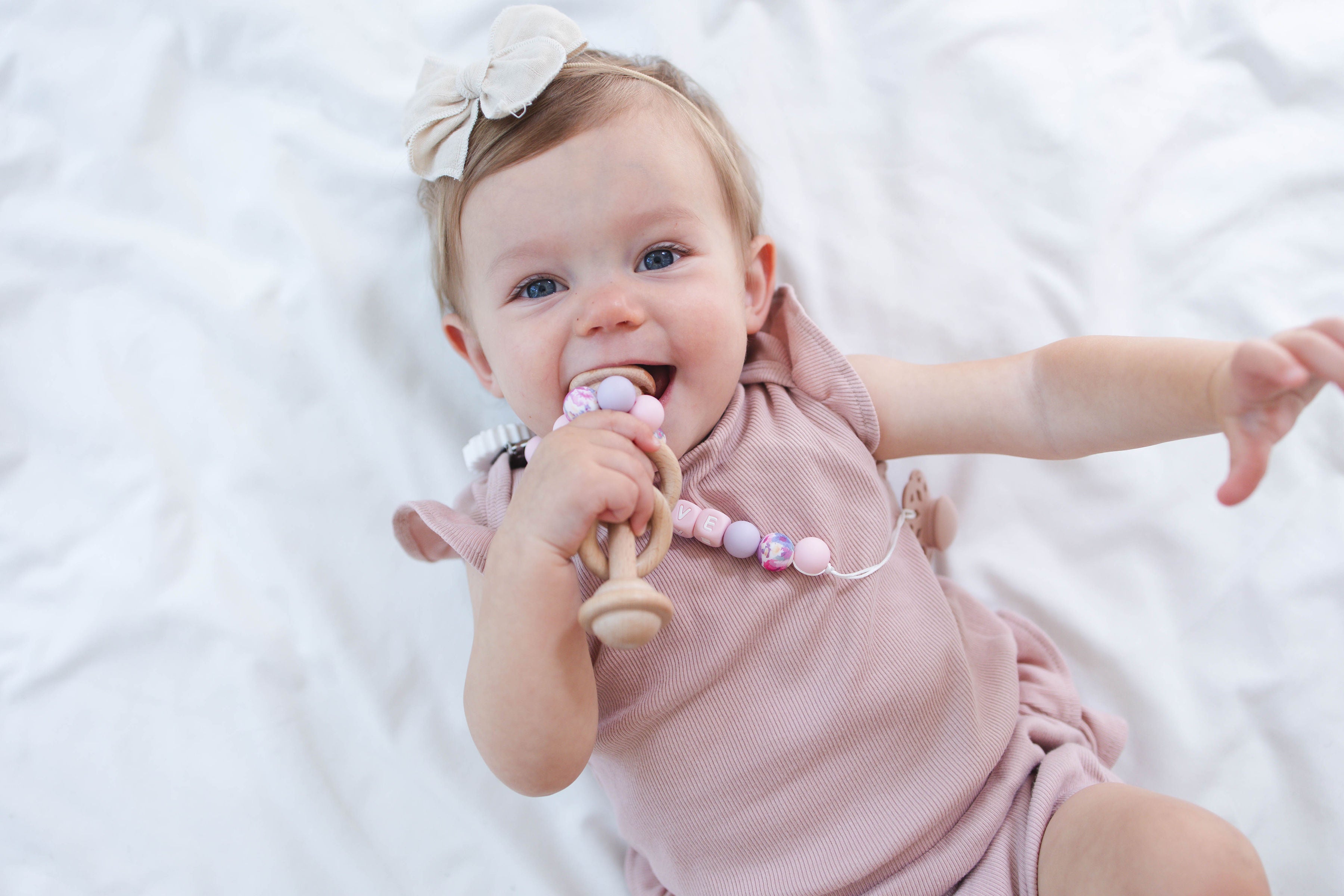 White Flower Pink Letter Blocks Pacifier Clip & Rattle