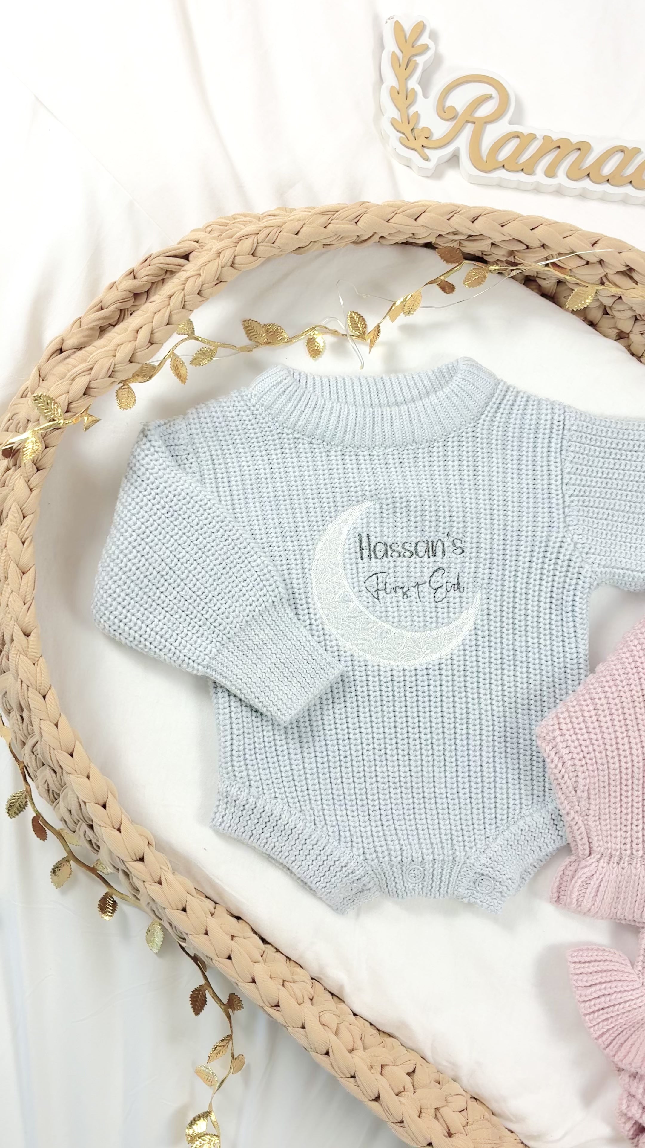 This personalized knit baby romper is designed to celebrate your baby’s First Eid with simplicity, meaning, and timeless style. Featuring a delicately embroidered crescent moon and “First Eid” wording, this piece is made to be worn on the day and treasured long after.